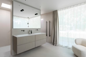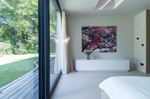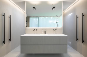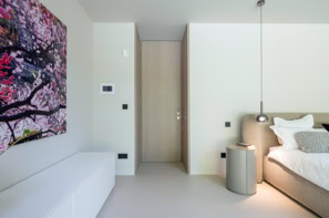 Die Innenarchitektur folgt einem klaren, reduzierten Konzept, das auf das Wesentliche fokussiert ist. Samtige Bodenspachtelungen erzeugen eine warme, fließende Oberfläche, während maßgefertigte, perfekt angepasste Schrank- und Möbellösungen zurückhaltend integriert sind. Jedes Element ist präzise auf die Architektur abgestimmt, wodurch eine ruhige und gleichzeitig elegante Atmosphäre entsteht.