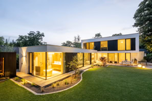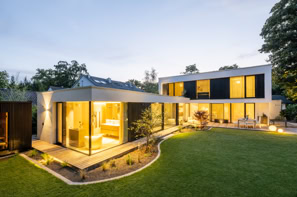 Zum Garten hin ist der Anbau nahezu vollständig verglast. Raumhohe Schiebetüren lassen die Räume fließend in den Außenbereich übergehen und sorgen für maximale Lichtdurchflutung.