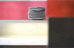 Die historische Substanz des Gebäudes bildet mit seiner altertümlichen Anmutung, seinen fast meterstarken, schiefen Steinwänden und seinen polygonalen Räumen den Rahmen für wenige, präzise innenarchitektonische Implantate: die beiden Küchenblöcke und vier große Tische stehen als einzige Elemente frei im Raum. Die offene Küche ist das zentrale Element der Bar und ermöglicht den Gästen am Geschehen teilzuhaben.